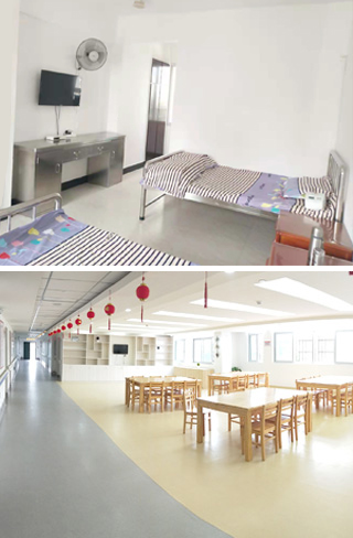 一层综合服务区,设迎客休息、接待咨询、医务诊疗、医技检查、功能复健休闲活动等区域,以及评估室、多媒体活动室。二层至七层设有套间,单人间,双人间,多人间等四种房型。每个房间均有氧气、独立卫生间和高清电视。卫生间内洗漱、淋浴、如便设施无障碍。